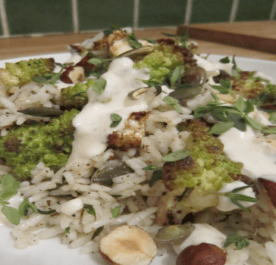 By Becky at limeandbarley.com This is a sort of warm autumnal salad, with a hearty base of rice, a spiking of beautiful middle Eastern za’atar, fresh thyme and a tahini-yoghurt dressing- plus toasted hazelnuts and pumpkin seeds. It is utterly delicious and a great way to use this more unusual variety of cauliflower – it’s [...]