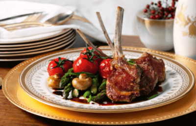 Lamb cutlets with asparagus and mushrooms with mirin glaze