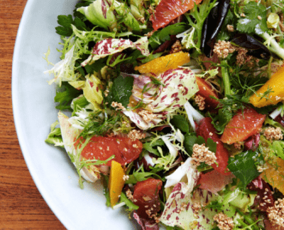 Recipe by Dan Kluger; photo by William Abranowicz,via www.bonappetit.com Think of the crunchy,granola-ish sesame clusters as seedy croutons for this juicy and bracing winter salad. Serves 8 Ingredients Sesame Clusters 1 large egg white 3 tablespoons sugar 1⁄2 teaspoon salt 1⁄4 teaspoon ground cinnamon 1⁄4 teaspoon ground cloves 1⁄4 teaspoon ground nutmeg 1 cup sesame [...]