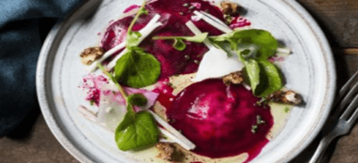 Beetroot ravioli with goat cheese, walnuts & watercress
